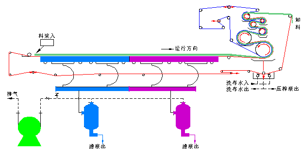 真空帶式壓榨過濾機(jī)是以濾帶為過濾介質(zhì),充分利用物料的重力、真空吸力、S形輥擠壓力實(shí)現(xiàn)固液分離的高效分離設(shè)備。采用整體可拆式過濾盤作為真空室,以S形擠壓輥?zhàn)鳛橥饬Γ瑸V帶在電機(jī)拖動(dòng)下做連續(xù)運(yùn)行,過濾行程開始時(shí),濾盤在真空狀態(tài)下與濾帶同步運(yùn)行,在非真空狀態(tài)下濾盤與濾布作相對(duì)運(yùn)行。物料通過料漿分布器均布在真空濾盤的過濾帶上,濾帶上料漿在真空吸力的作用下進(jìn)行抽濾,直到真空濾盤碰到接近開關(guān)位置,下濾帶的濾餅在電機(jī)的拖動(dòng)下繼續(xù)運(yùn)行并進(jìn)入S形擠壓輥同時(shí)上濾帶在物料進(jìn)入S形擠壓輥后進(jìn)行擠壓以降低濾餅含濕量。過濾、洗滌、再過濾、擠壓后的濾餅經(jīng)刮刀裝置將濾餅剝離卸除,濾布經(jīng)自動(dòng)再生裝置清洗后,再經(jīng)過一組支承輥和糾偏裝置重新進(jìn)入過濾區(qū),集液罐濾液隨著濾盤返回同時(shí)排出,擠壓輥中的濾液流入收集盤。通過這樣周而復(fù)始的抽濾、洗滌、再抽濾、擠壓,從而實(shí)現(xiàn)固液分離的目的。